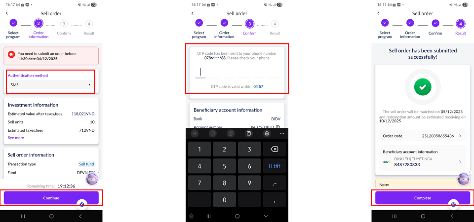 - Step 7: Tap [Complete] to finalize the order. The sell order will be displayed under [Pending Order].