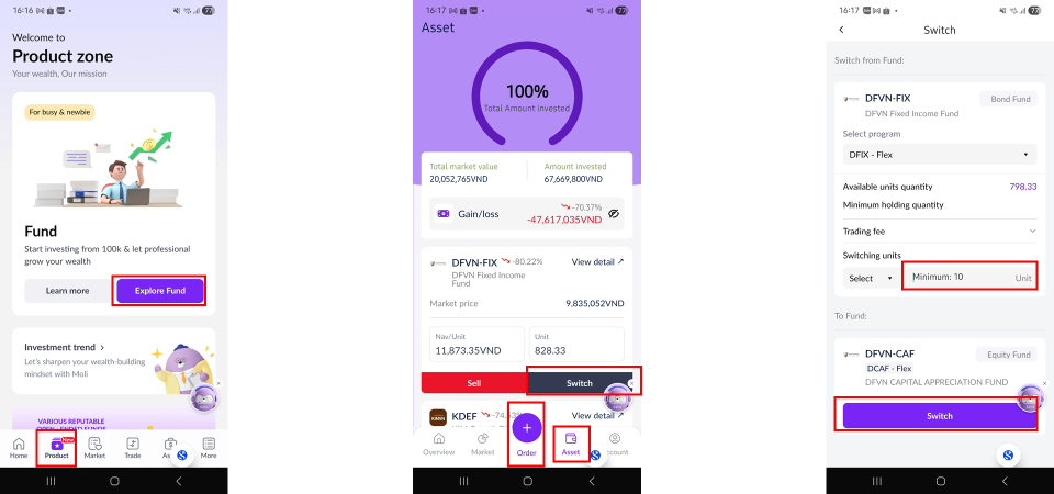 - Step 4: Enter the quantity of fund certificates to switch (please note the required minimum quantity), then tap [Switch].