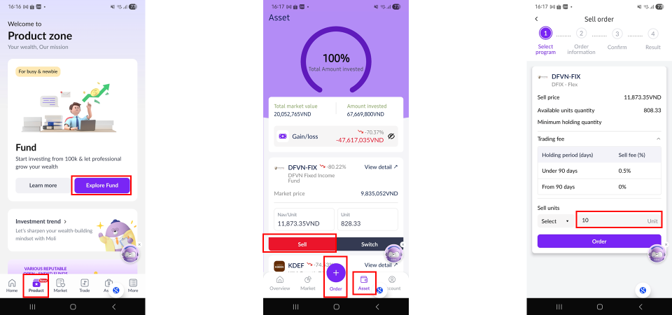 - Step 4: Enter the quantity of fund certificates to sell (please note the required minimum quantity), then tap [Order].