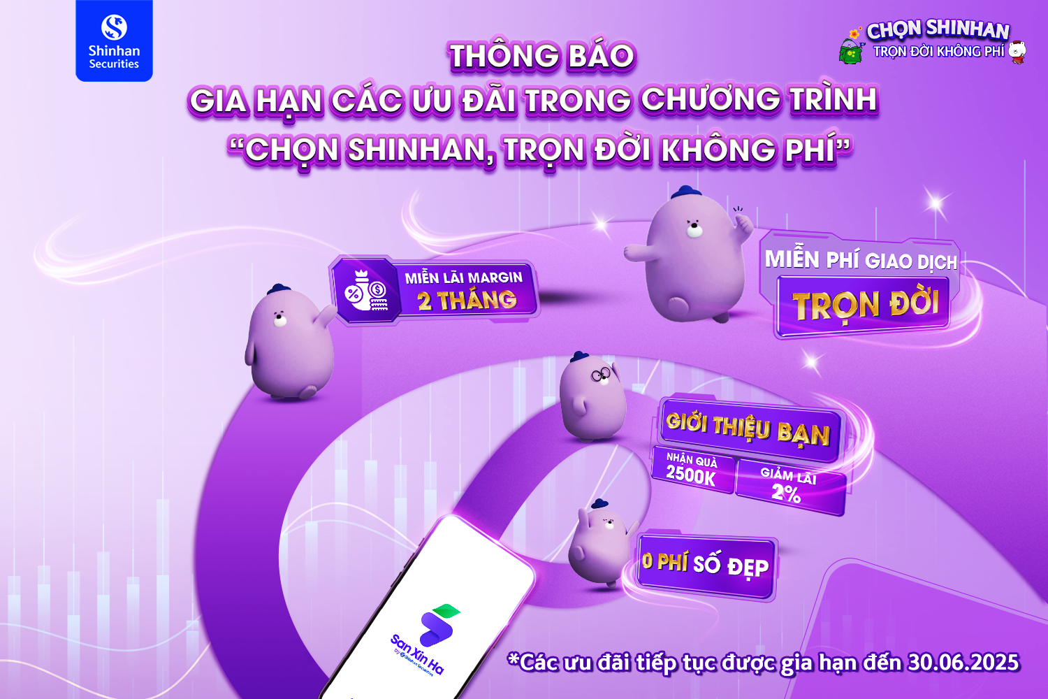 Chứng khoán Shinhan Việt Nam (SSV) xin trân trọng thông báo gia hạn các ưu đãi trong chương trình “Chọn Shinhan, Trọn đời không phí”.
