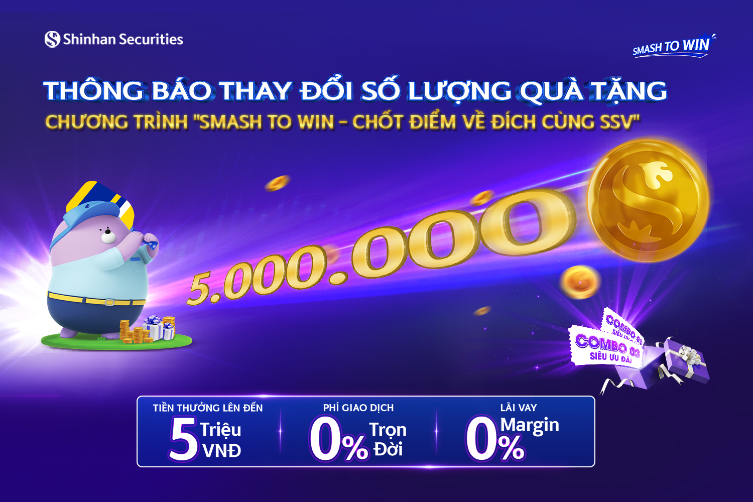 Chứng khoán Shinhan Việt Nam (SSV) xin thông báo đến Quý Khách hàng về việc điều chỉnh số lượng quà tặng trong chương trình ưu đãi “Smash to Win – Chốt điểm về đích cùng SSV", cụ thể như sau: