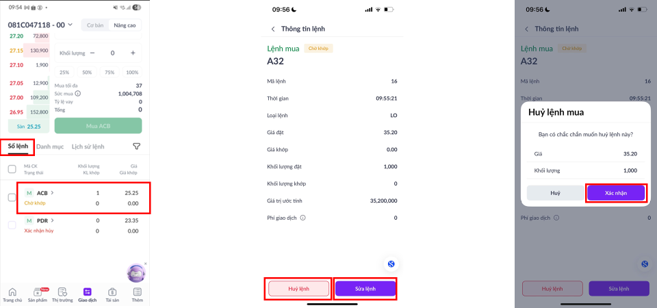 + [Hủy lệnh]: Dùng để thực hiện hủy lệnh giao dịch, Quý khách vui lòng chọn [Hủy lệnh], chọn [Có] để thực hiện hủy.
