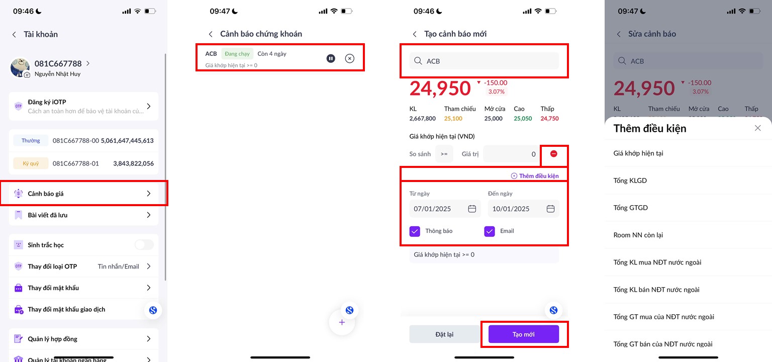 Cách 2: Thực hiện tạo và quản lý cảnh báo tại phần thông tin [Tài khoản] như sau: