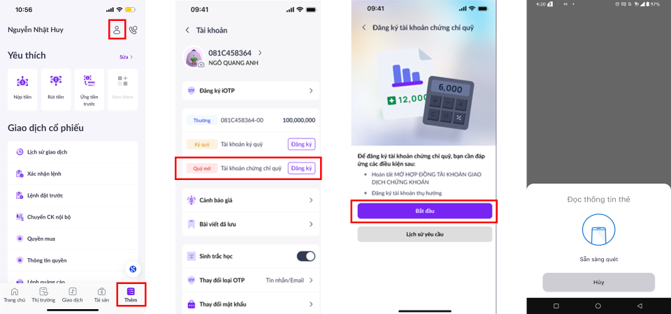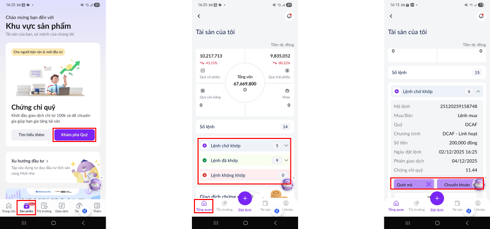+ [Quét mã] hoặc [Chuyển khoản]: Được dùng để thực hiện thanh toán khi thực hiện mua chứng chỉ quỹ. Chỉ áp dụng cho lệnh mua chứng chỉ quỹ khi quý khách chưa thực hiện chuyển đủ tiền theo yêu cầu.