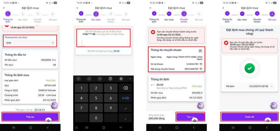 - Bước 7: Thực hiện chuyển khoản số tiền đặt mua và chọn [Tiếp tục]. Lệnh chỉ có thể khớp sau khi KH thực hiện chuyển khoản tiền theo đúng thời gian Quy định.