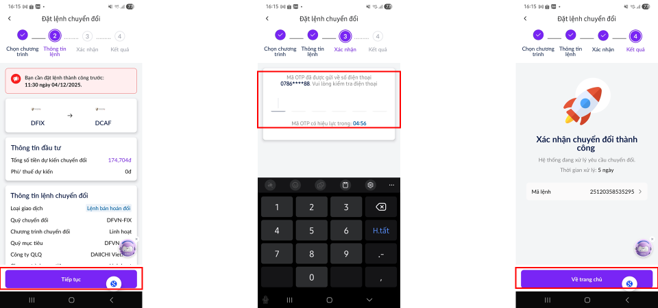 - Bước 5: Chọn [Tiếp tục], và nhập mã OTP để xác nhận chuyển đổi.