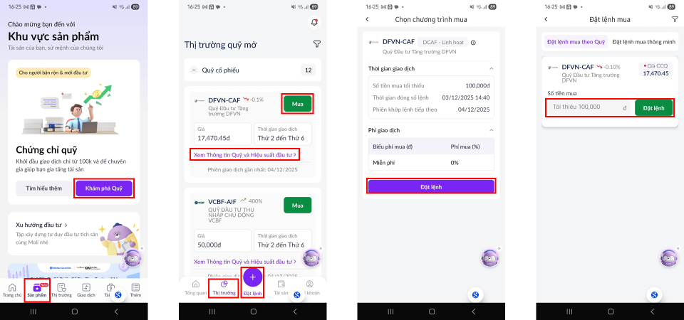 - Bước 3: Thực hiện kiểm tra thông tin quỹ, phí giao dịch và ấn nút [Đặt lệnh] để bắt đầu.