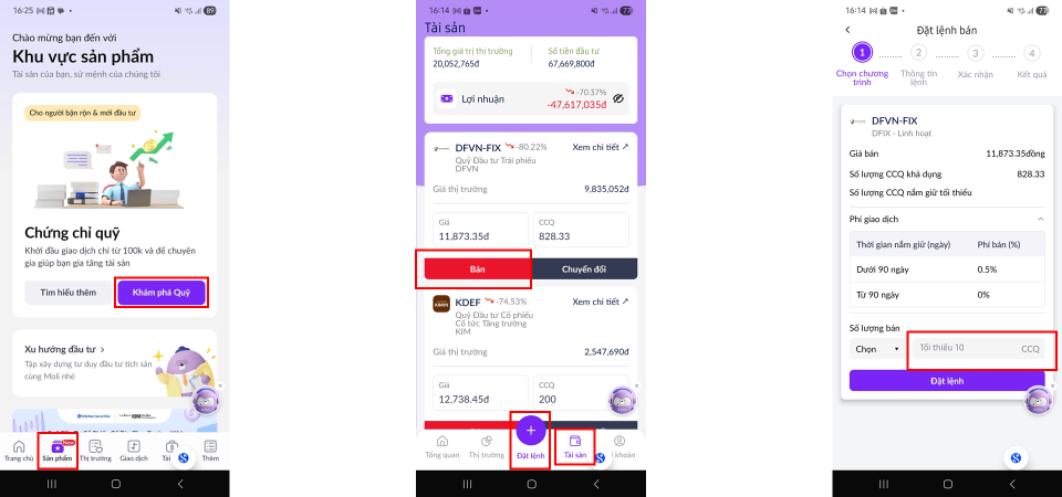 + Chọn mục [Tài sản], chọn mục chứng chỉ cần bán, chọn nút [Bán].