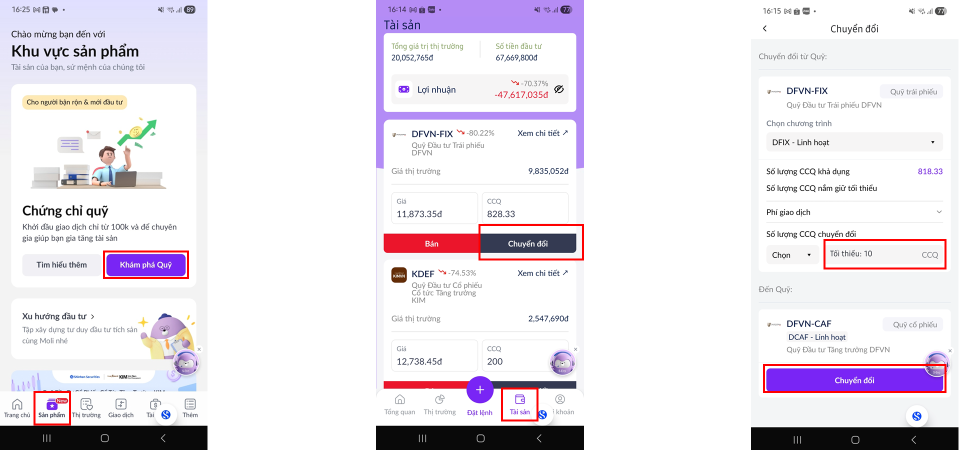 - Bước 4: Nhập số lượng chứng chỉ quỹ cần chuyển đổi (Lưu ý về số lượng tối thiểu yêu cầu) và ấn nút [Chuyển đổi].
