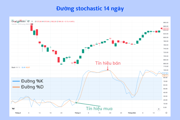 • Khi đường %K cắt lên trên đường %D ở vùng giá trị dưới 20 là một tín hiệu mua.
