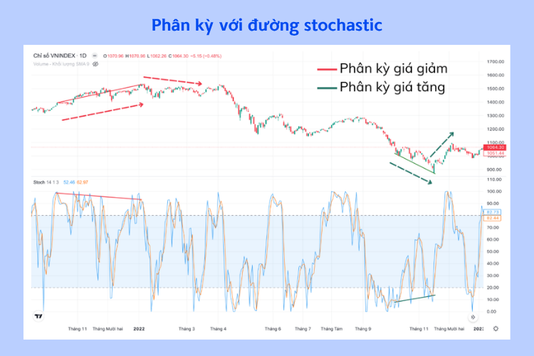 • Phân kỳ giảm xuất hiện khi giá có xu hướng tăng nhưng đỉnh sau của đường %D thấp hơn đỉnh trước và đang nằm trên vùng 80 ⇒ Báo hiệu tín hiệu giảm.