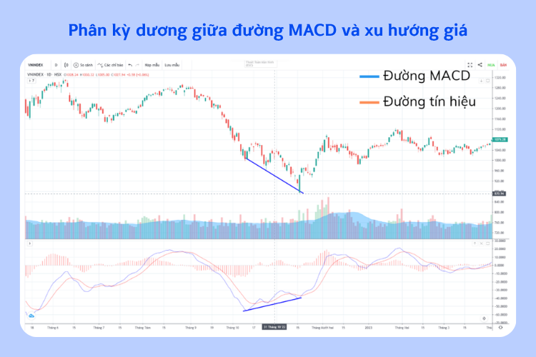Phân kỳ dương (dấu hiệu đảo chiều tăng) xuất hiện khi đường MACD nằm dưới và cách xa đường số 0. Đường MACD tạo đáy sau cao hơn đáy trước trong khi giá tiếp tục giảm, điều này tạo ra tín hiệu phân kỳ.