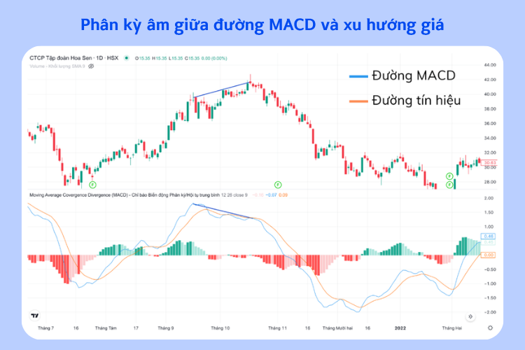 Phân kỳ âm (dấu hiệu đảo chiều giảm) xuất hiện khi đường MACD nằm ở trên và cách xa đường số 0. Đường MACD tạo đỉnh sau thấp hơn đỉnh trước trong khi giá vẫn tiếp tục tăng, điều này tạo ra tín hiệu phân kỳ xấu.