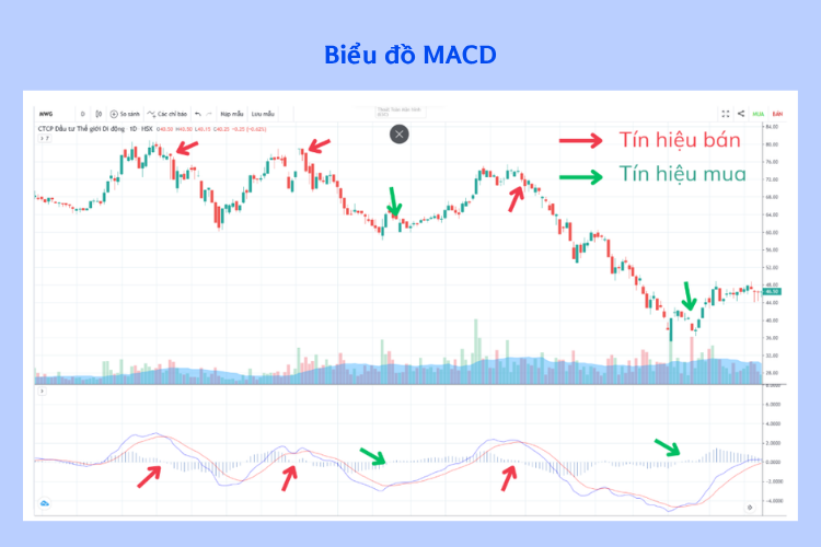 • Biểu đồ MACD thể hiện điểm khác nhau giữa đường MACD và đường tín hiệu.